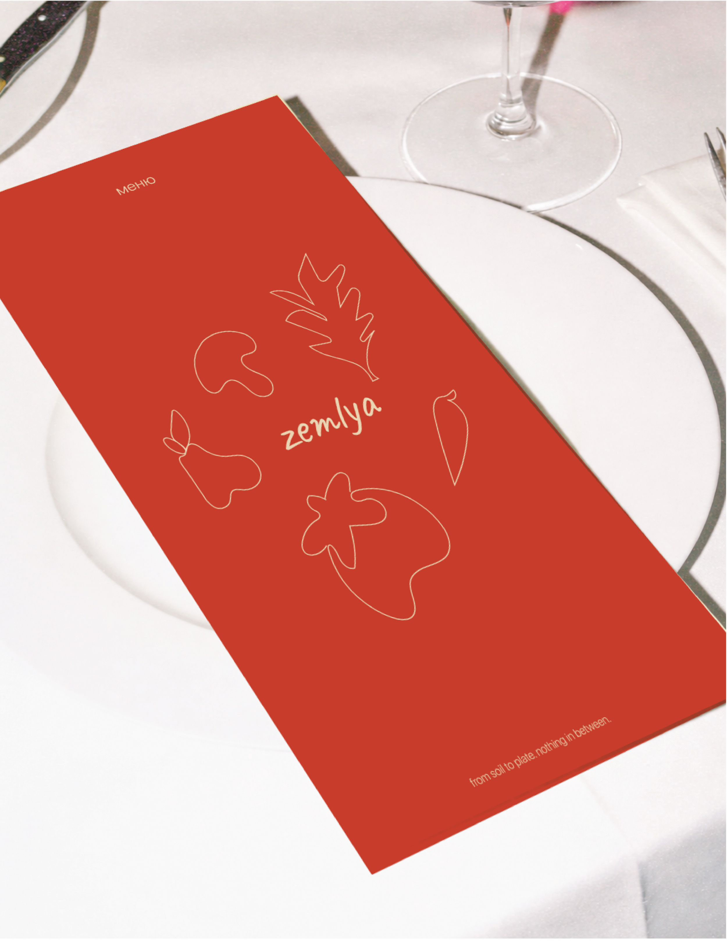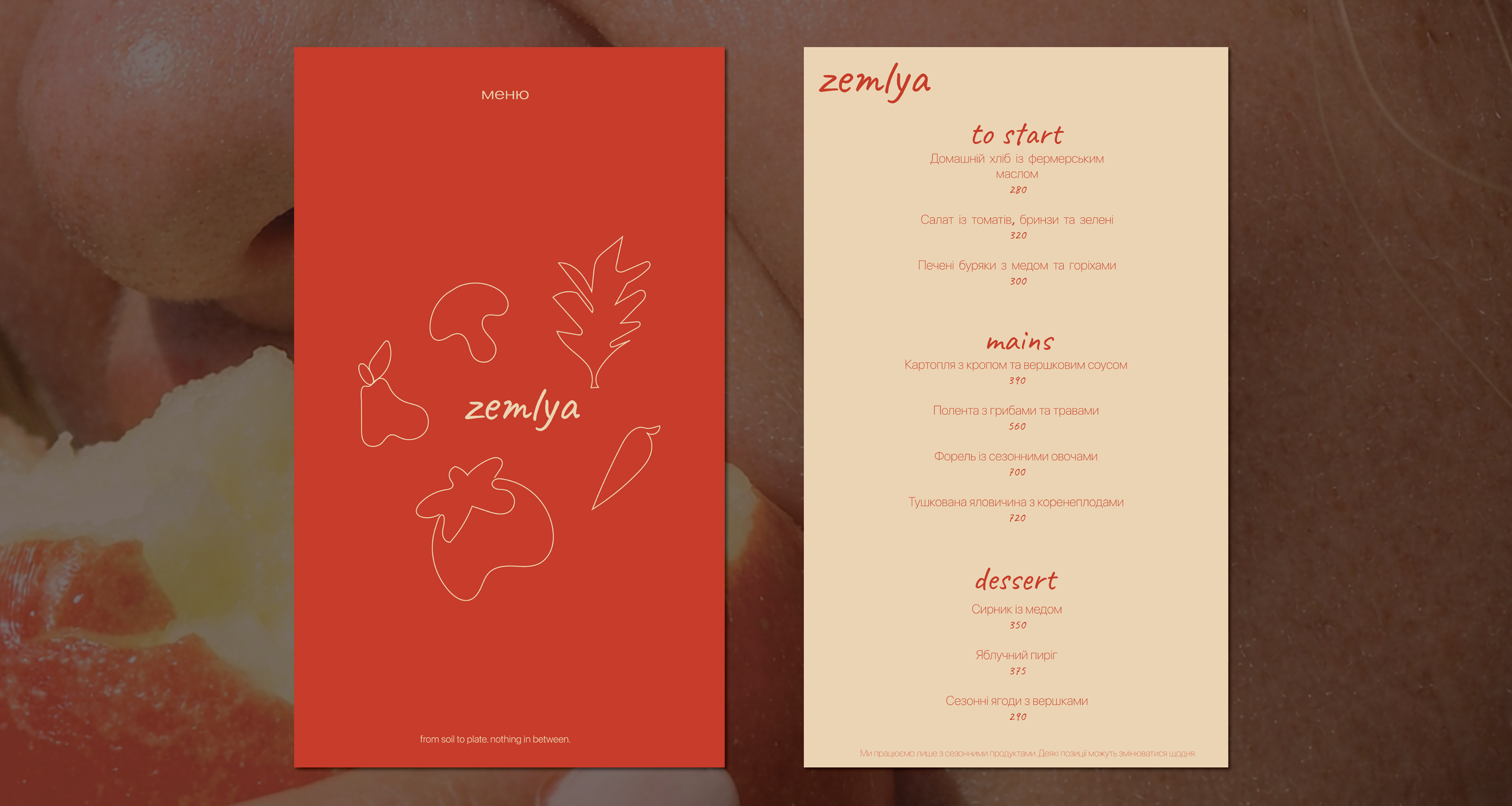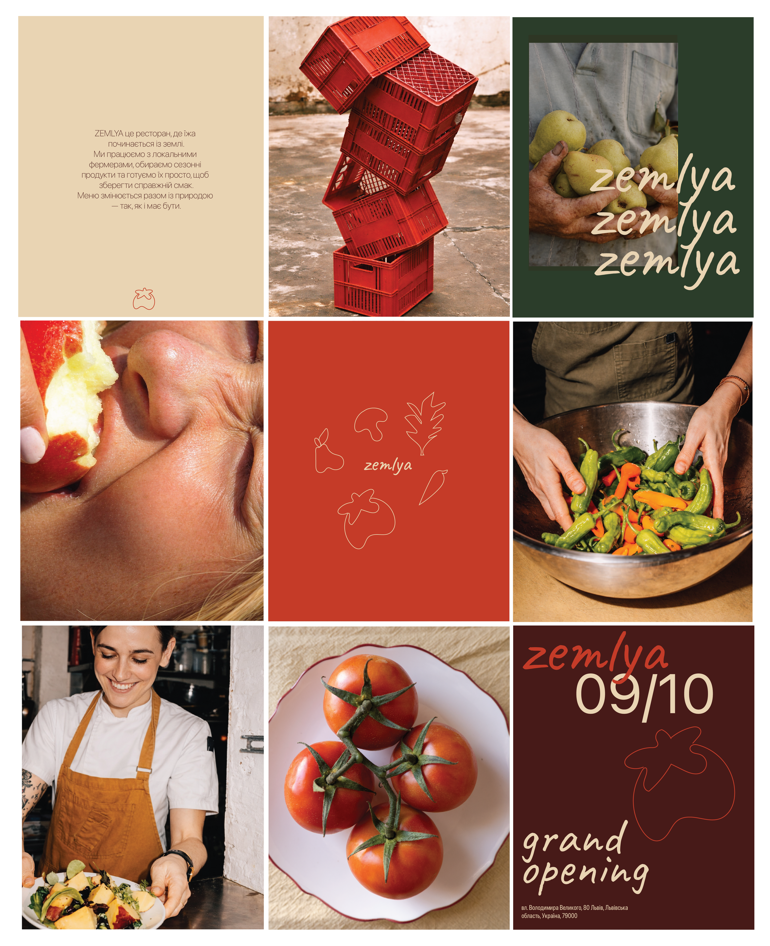 ZEMLYA is a farm-to-table restaurant in Ukraine focused on seasonal cooking, local sourcing, and simple, honest food, for which a complete brand identity was developed including naming, visual direction, tone of voice, menu design, and copywriting. The name “ZEMLYA” reflects the restaurant’s approach of working directly with local farmers. The visual identity is minimal and grounded, inspired by natural materials and Ukrainian landscapes, using a neutral color palette, refined typography, and clean editorial layouts to create a contemporary yet warm atmosphere across print and digital applications.